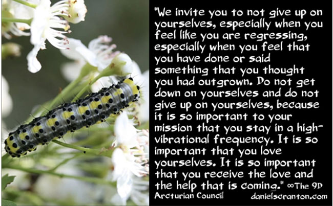 We invite you to not give up on yourselves, especially when you feel like you are regressing, especially when you feel that you have done or said something that you thought you had outgrown. Do not get down on yourselves and do not give up on yourselves, because it is so important to your mission that you stay in a high-vibrational frequency. It is so important that you love yourselves. It is so important that you receive the love and the help that is coming from the higher realms, both physical and nonphysical, and you are more likely to receive that help when you are loving yourselves unconditionally.
