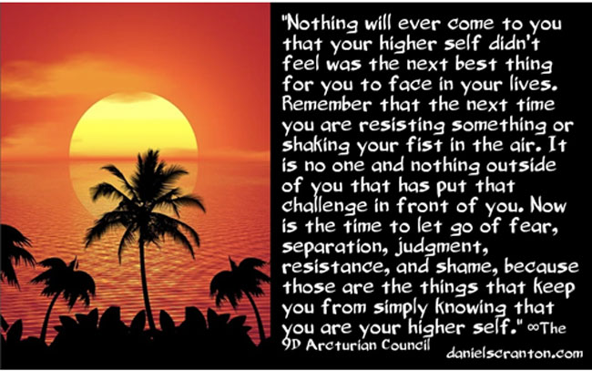 Therefore, nothing will ever come to you that your higher self didn’t feel was the next best thing for you to face in your lives. Remember that the next time you are resisting something or shaking your fist in the air. It is no one and nothing outside of you that has put that challenge in front of you. Now is the time to let go of fear, separation, judgment, resistance, and shame, because those are the things that keep you from simply knowing that you are your higher self.